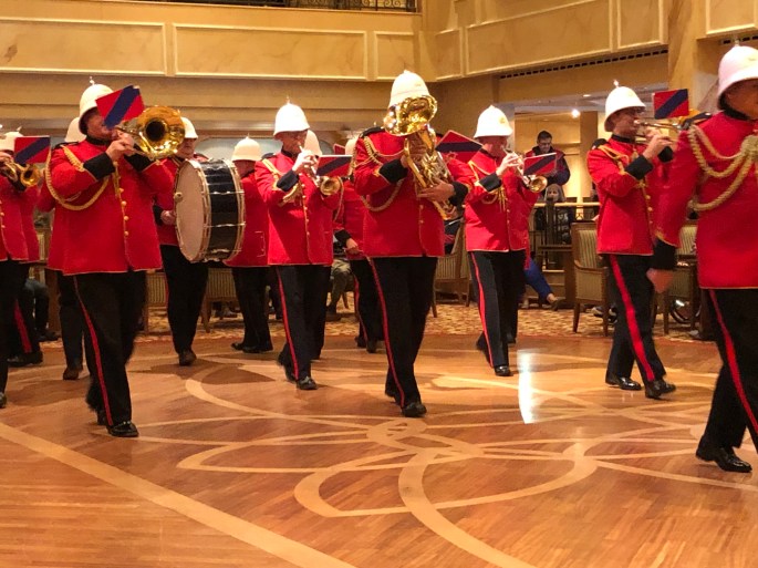 Es begann mit einer Zeremonie auf Deck 2, wo sonst immer der ‚High Tea‘ nachmittags stattfindet. Unglaublich- es marschierte die British Imperial Military Band ein und spielte bekannte Stücke aus ‚The Last Night of the Proms‘! Hier eine kleine Kostprobe!