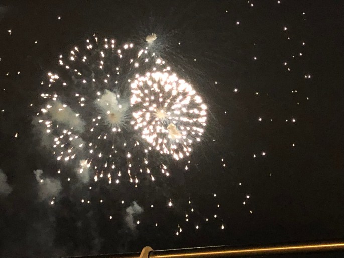 Und weiter ging es im Programm: wir wurden auf die Aussendecks gerufen und staunten nicht schlecht: vor uns lag die Queen Mary – und ein tolles Feuerwerk begann, 15 Minuten lang!