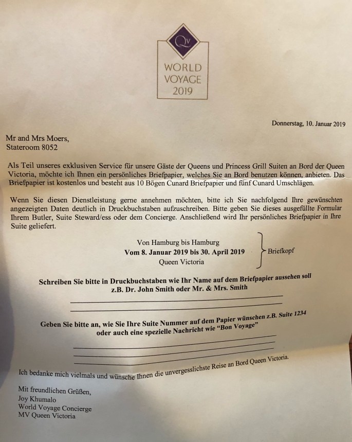 Und gestern gab es noch zwei Überraschungen: 1. wir durften uns personalisiertes Briefpapier bestellen. 2. wir haben eine Einladung zum Captain’s Table bekommen. Wie der Abend war? Ich werde es euch ausführlich berichten!