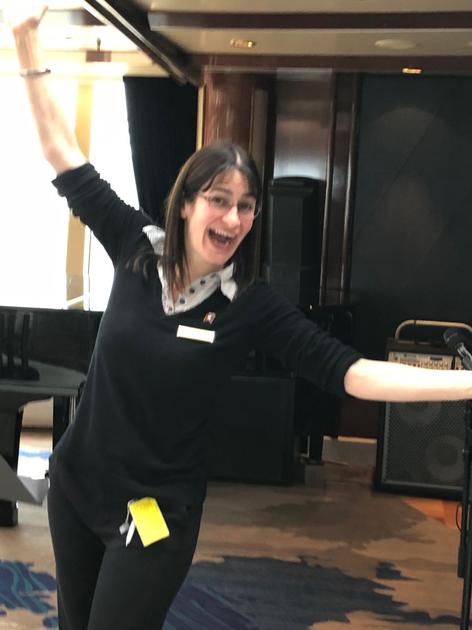 Das ist unsere kompetente und mit jeder Menge britischem Humor ausgestattete Chorleiterin Cordelia. Ihr könnt sehen, wieviel Spaß wir haben!
