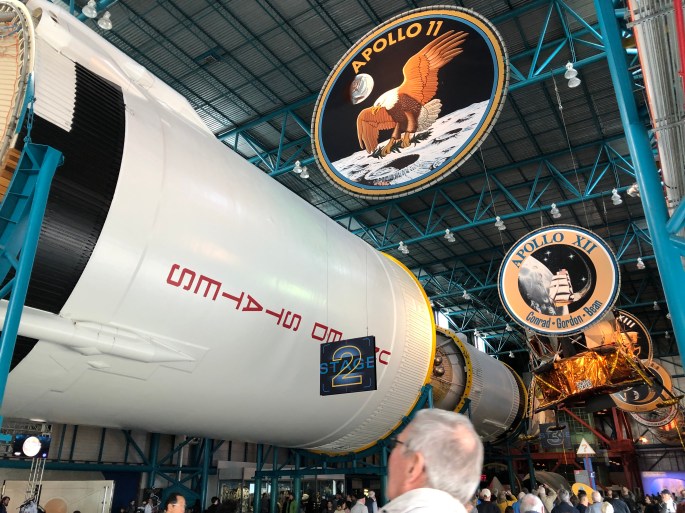 Diese Rakete dominiert eine riesige Halle, von der aus man zu den unterschiedlichen Präsentationen gelangt.