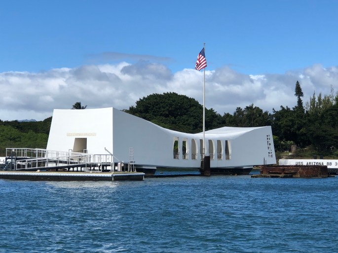 Nach einem eindrucksvollen Film von 25 Minuten geht es mit dem Boot zum USS Arizona Memorial. Wir können das Schiff leider nicht verlassen, da das Mahnmal aus weißem Marmor seit einiger Zeit wegen Renovierung geschlossen ist. Vom Boot aus können wir jedoch die unter dem Mahnmal liegende „USS Arizona“ erkennen.