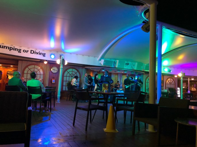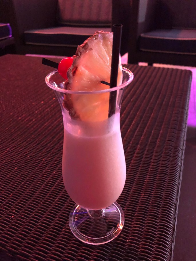 Am späten Abend spielt die Schiffsband Equinox auf dem hinteren Deck – natürlich tanzt man nicht nur, sondern genießt auch den passenden Cocktail: Pina Colada.