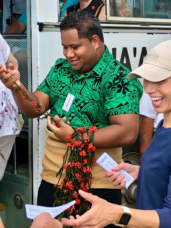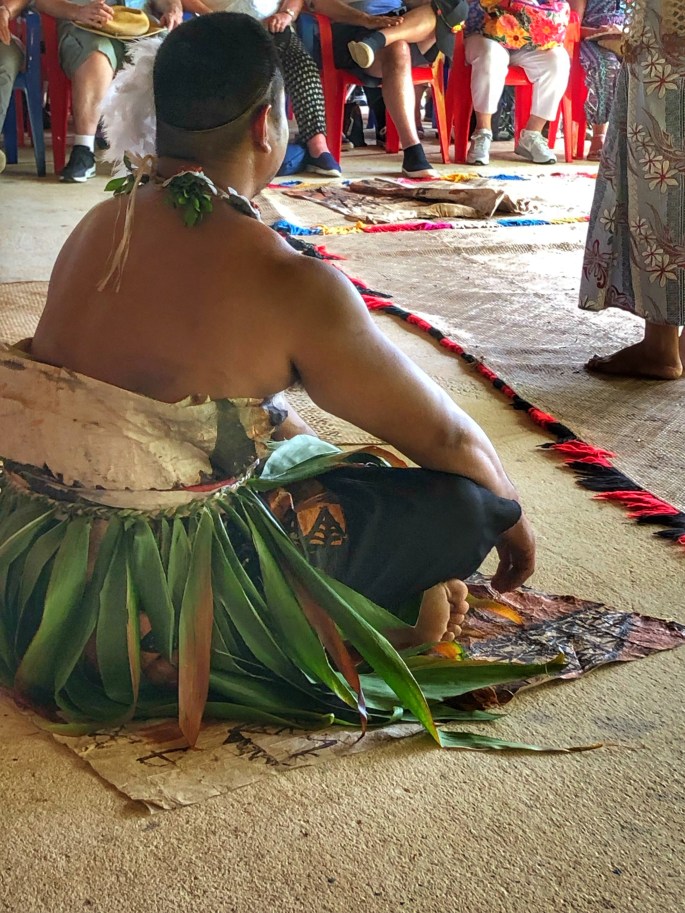 Ein Glücksfall: er macht seine Sache sehr gut, liefert Hintergrundinformationen über Land und Leute, Geschichte und Kultur. Er trägt wie alle Männer hier auf der Insel (und auch auf Samoa) einen schwarzen Herren-Rock, mit bunten Hemd. Allerdings trägt man um Respekt zu zeigen zusätzlich eine traditionelle geflochtene Bastschärpe um die Hüften. Es sieht ein bisschen merkwürdig aus, wenn er mit dieser Bekleidung ganz professionell sein Handy bedient.
