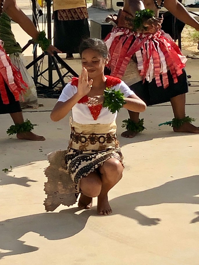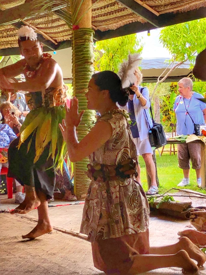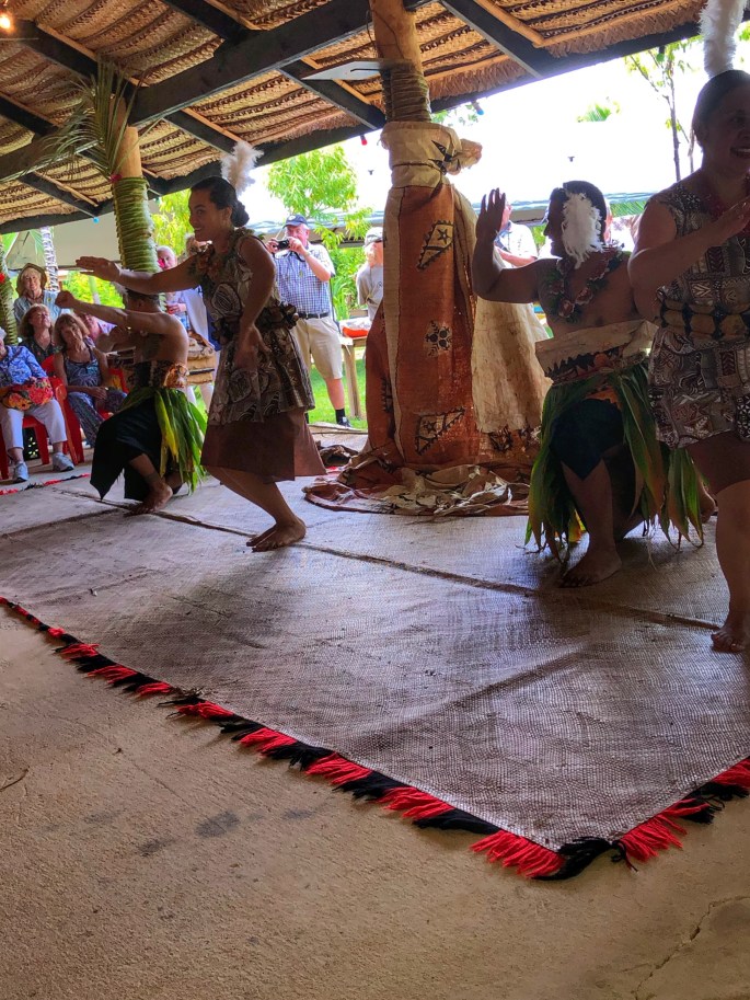 Das alles findet in einem mit Palm-Blättern gedeckten großen Gebäude ohne Wände statt. Auch hier hatte der Wirbelsturm alles zerstört, die Familie ist noch im Wiederaufbau. Alle drei Generationen: Großmutter, Tochter und Enkelin sind aktiv an der Präsentation beteiligt. Eine der Töchter (Ende Zwanzig) ist die Moderatorin und erklärt die einzelnen kulturellen Besonderheiten. Sie hat lange in Australien gelebt und spricht exzellentes Englisch. Sie kam nach dem Wirbelsturm mit ihrer Familie zurück, um beim Wiederaufbau zu helfen.