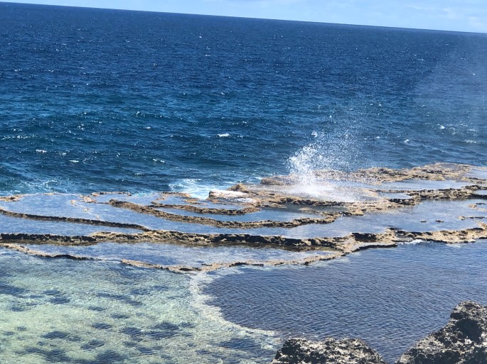 Zwei Stunden sind wie im Flug vergangen, der Einblick in den tonganischen Way of Life war spannend und abwechslungsreich. Weiter geht es zu einem Küstenabschnitt mit einer atemberaubenden Aussicht auf das türkis-grüne Meer. Kein Strand, sondern Felsen und Korallen, die waagrecht abgeflacht sind und in denen sich kleine Löcher befinden, sogenannte Blow-Holes, durch die das Wasser wie in einem Geysir ein bis zwei Meter hoch gepresst wird.