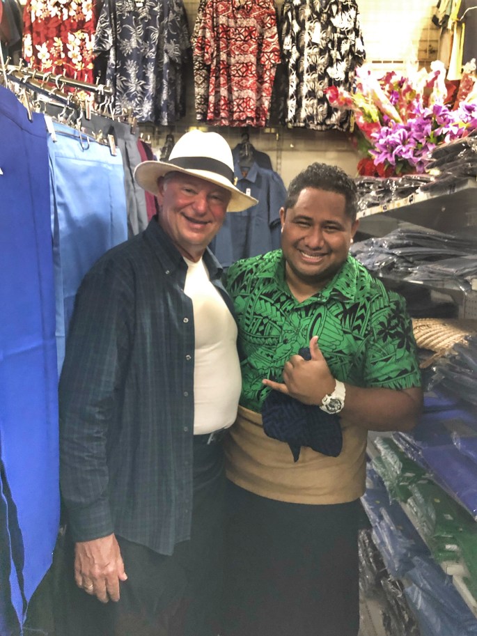 Am frühen Nachmittag endet die offizielle Tour, aber unser Tourguide Lava erklärt sich bereit, uns zu zeigen, wo man eine ‚Lava-Lava‘ (also den traditionellen Männerrock) erstehen kann. Ein einheimisches Geschäft, nur wenige Schritte von der Hauptstraße entfernt, hat das Gewünschte in allen Grössen verfügbar. Dazu die passenden Hemden mit einheimischem Muster – alles für kleines Geld.