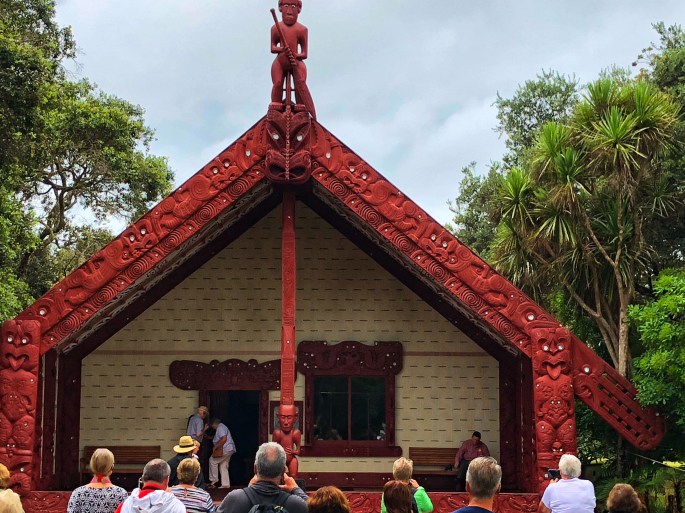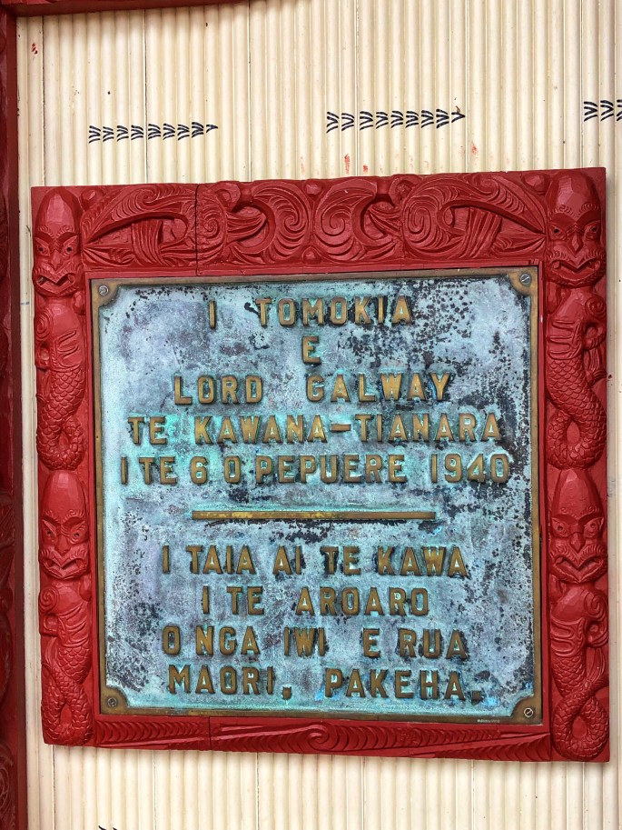 Zur Erinnerung an die Maori wurde neben dem ‚Waitangi-Treaty-House‘ ein traditionelles Versammlungshaus errichtet. Es ist reich mit Holzschnitzarbeiten ausgestattet und erinnert an den Vertragsschluss am 6. Februar 1840. Deshalb ist dieser Tag neuseeländischer Nationalfeiertag.