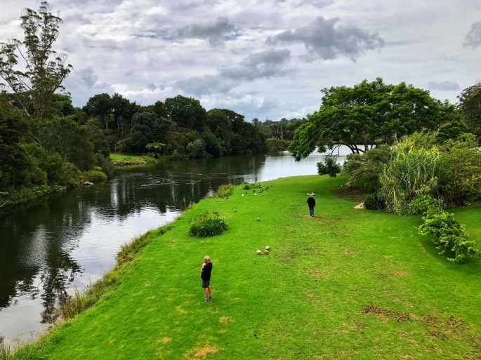 Nur wenige Kilometer entfernt der Whangarei-Wasserfall. Eigentlich fließt hier nur ein kleiner Fluss – aber wenn das Wasser 26 m tief über die Basalt-Klippen fällt, ist das schon beeindruckend.