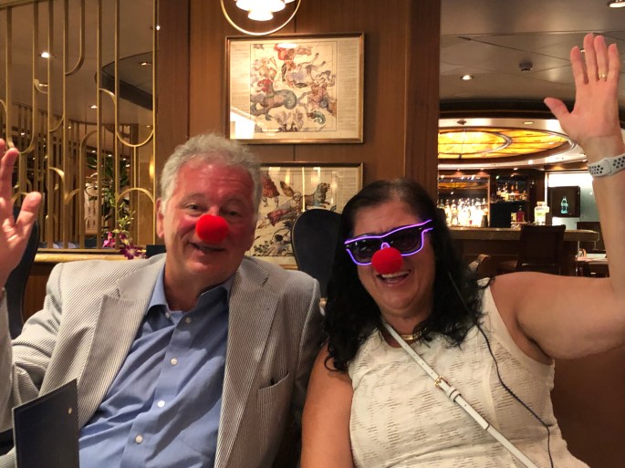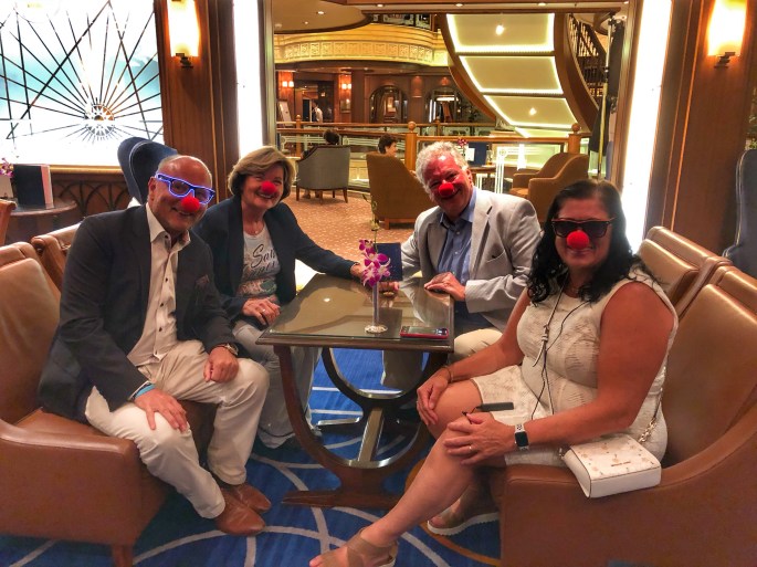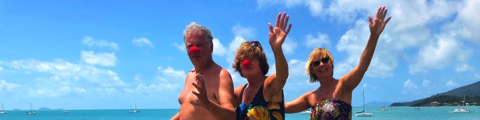 Natürlich haben wir auch Clownsnasen (von Zuhause) dabei. Und damit veranstalten wir den kleinsten Rosenmontagszug, der je (in Airlie Beach) stattgefunden hat! Ein befreundetes Ehepaar macht mit (einer musste fotografieren).