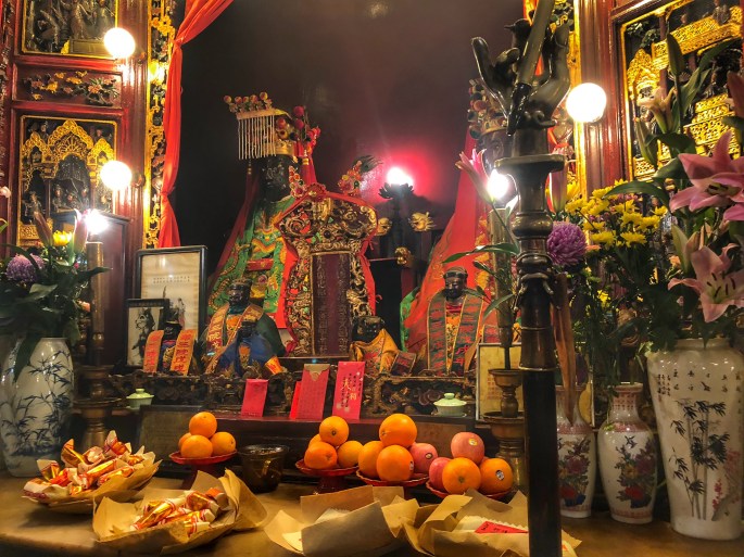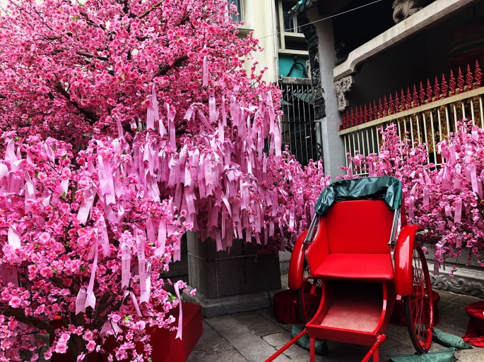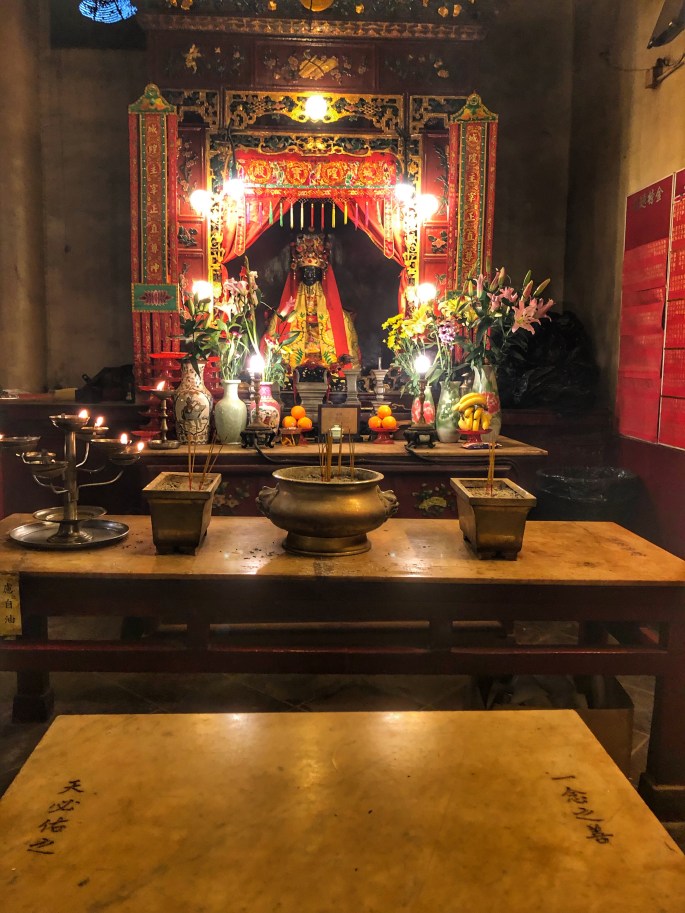 Und man findet mitten in der Stadt immer wieder buddhistische Tempel, wie hier den Man-Mo-Tempel inmitten von Hochhäusern. Unser Guide erklärt: Hier gibt es zwei mächtige Schutzheilige, die für das Zivile (kantonesisch: man) und das Militärische (kantonesisch: mo) zuständig sind. Der mittlere Teil des Tempels ist eher für die Frauen: hier finden sie Trost bei der buddhistischen Barmherzigkeitsgöttin Guanyin. Der rechte Teil fungiert eher als Ahnentempel, wo man für 180.000 Hongkong Dollar einen Platz für die Asche eines Verstorbenen kaufen kann. Die Erlöse gehen an ein Spital.
