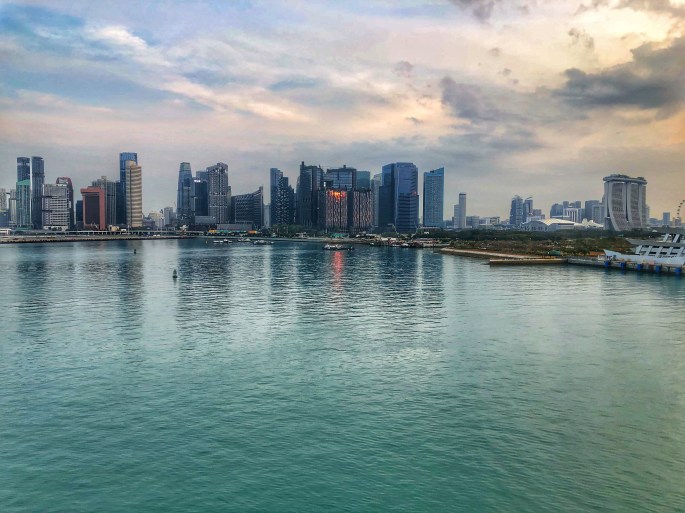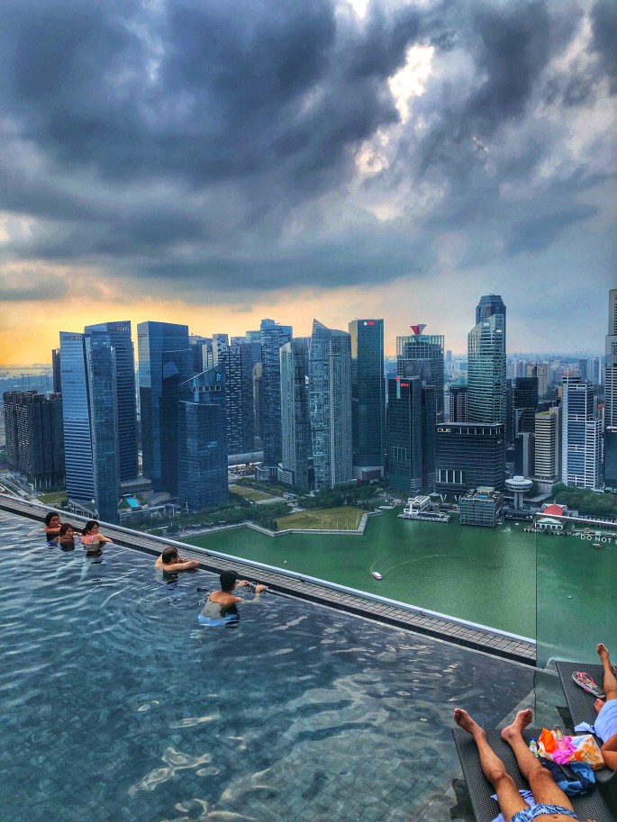 Wenn man Singapur besucht, muss man einmal auf dem Dach des Marina Bay Sands Hotels gewesen sein (bei einem eintägigen Aufenthalt eine Herausforderung). Das Gebäude ist an vielen Plätzen der Stadt zu sehen – seine eigenartige Architektur und seine Dominanz überstrahlen die ganze Stadt.