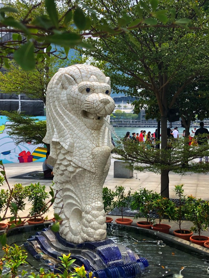 Noch heute steht der Merlion am Hafen – eine Skulptur halb Löwe halb Fisch und speit Wasser in die Marina Bay. Der Merlion war bei unserem Besuch leider ‚under construction‘ – aber es gab direkt neben der Statue einen kleinen Nachbau für die Touristen.
