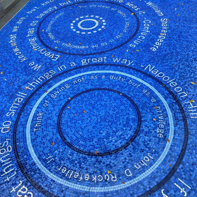 Deshalb sind wegweisende Zitate berühmter Persönlichkeiten auch gleich als Mosaik in den Boden eingelassen.