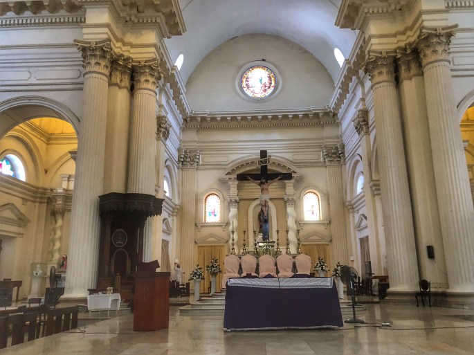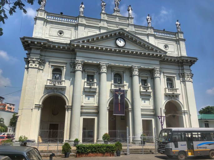 Tourguide Lal macht aus der Not eine Tugend und ermöglicht uns den Besuch einer katholischen Kirche, der Bischofskirche der Hauptstadt. Dort ist es angenehm kühl und vor allen Dingen ruhig. Draußen tobt der Verkehr mit vielen Tuck-Tucks, die als Taxen fungieren. Die Kirche selbst ist innen eher bescheiden und zeigt nichts von der üblichen Opulenz katholischer Kirchen.
