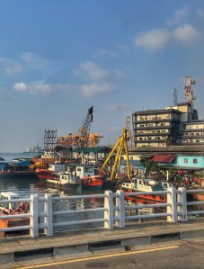 Nein, wir liegen in einem Container-Hafen. Und dieser Hafen hat es in sich: jede Menge Verkehr, viele ein- und auslaufende Schiffe, Schüttgut-Kräne und Container-Transporter! Es ist schon erstaunlich aber nicht verwunderlich, dass unser Tourguide Lal später stolz erklärt, der Hafen von Colombo gehöre zu den Top 5 in Südostasien.