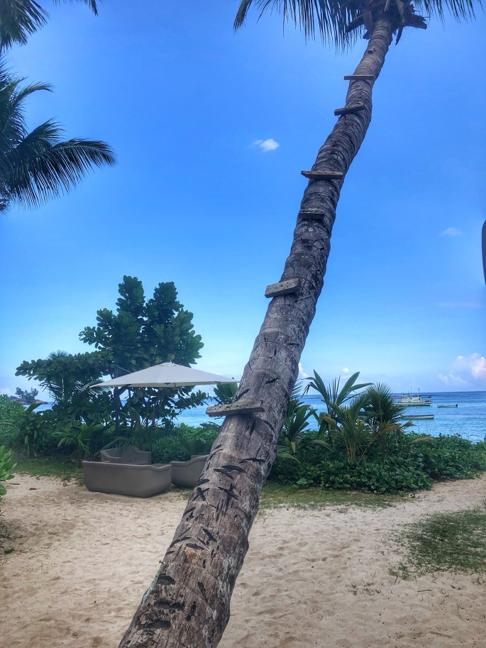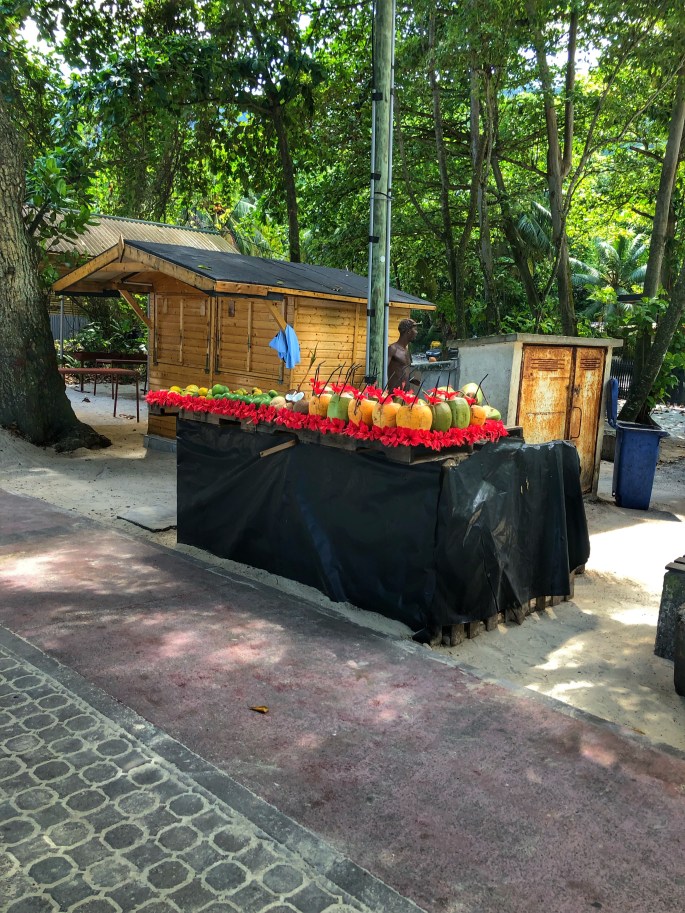 Am Strand von Beau Vallon sahen wir u.a. die größte Nuss der Welt – die Coco de Mer. Es handelt sich hierbei um die Frucht der Seychellenpalme, die als weltweit größte Kokosnussart gilt und ihren Namen durch ein Missverständnis erhielt. An verschiedenen Stellen des Indischen Ozeans wurden vereinzelt „Coco-de-Mer“-Samen angespült. Da man sich die Herkunft nicht erklären konnte, nahm man an, dass diese Kokosnuss unter Wasser wachsen müsse. In getrocknetem Zustand ist sie schwarz. Ist sie jedoch frisch, hat sie eine grüne Farbe und wiegt bis zu 20 Kilogramm.