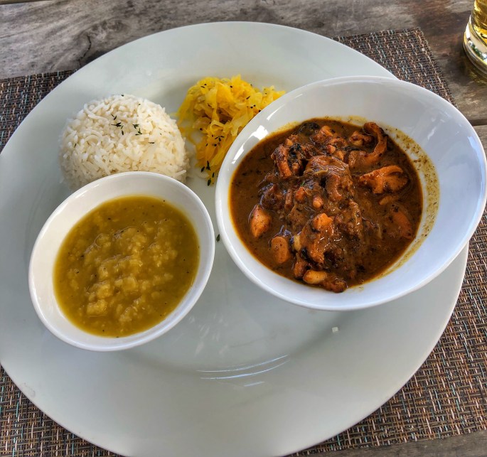 Und endlich waren wir am Ziel angekommen- Anse Royale! Das ist ein Strand, den die Einheimischen empfehlen mit einem kleinen Restaurant. Wir fühlten uns sofort wohl- die Bedienung war freundlich und wir wählten gekochtes Fleisch bzw. Tintenfisch mit Reis!