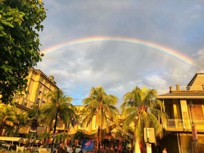 Wir hatten vor den letzten Shuttlebus zum Schiff zu nehmen, das man zwar von der Mall aus sehen konnte – hinlaufen war aber nicht möglich. Wir trafen noch unsere Bekannten Sigrid und Jürgen vom Schiff und warteten mit anderen Gästen um 17.30 Uhr brav auf den Shuttlebus von Cunard. Alle Mann an Bord war 18.30 Uhr. Leider kam kein Bus, zum Glück wartete auch ein Besatzungsmitglied – Lisa vom Pursers Desk, eine Deutsche! Der Organisator für den Shuttlebus hatte immer neue Ausreden, warum wir noch warten mussten: Unfall auf der Strecke, Stau etc. Es wurde 18 Uhr, 18.15 Uhr – nichts geschah. Lisa war sich nicht sicher, ob das Schiff Bescheid wusste. Inzwischen hatte es geregnet und wir sahen einen schönen Regenbogen – beruhigend aber war das nicht.