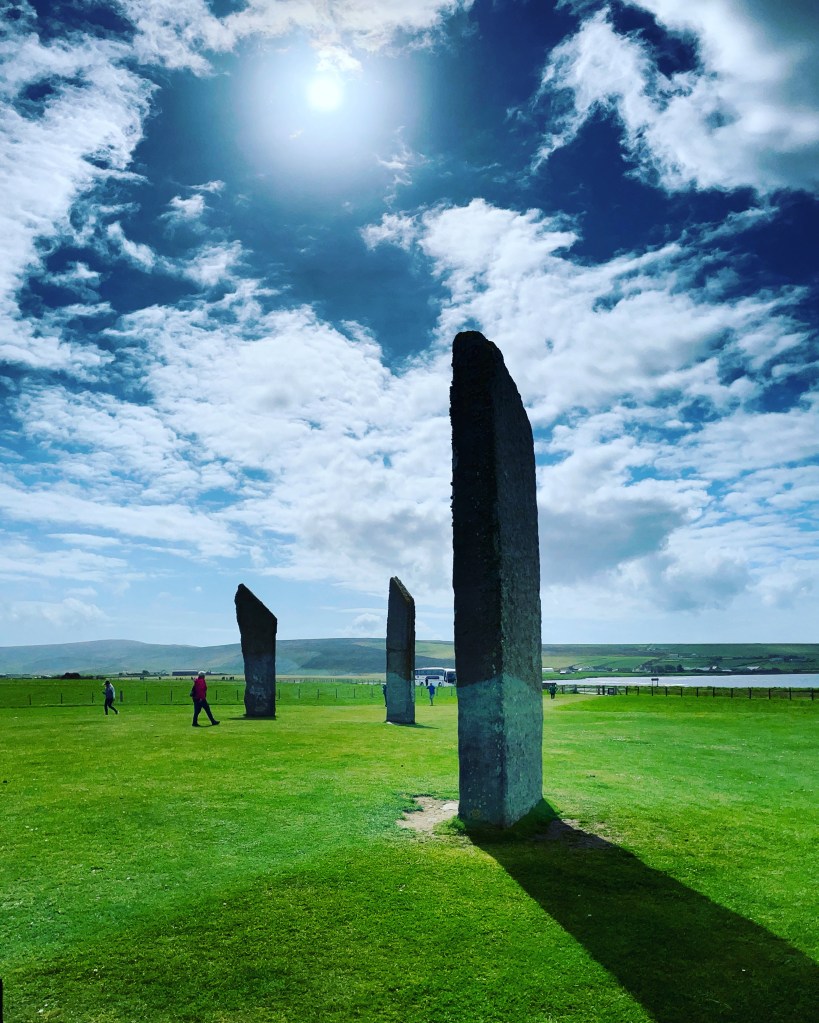 Unser Bus hielt an den Standing Stones of Stinness – eine aus der Steinzeit stammende Gruppe von Felsen – war Stonehenge in Kleinformat. Die Pictens haben früher diese Steinkreise und auch Holzquader aufgestellt. Nur die Steine sind erhalten geblieben. Man geht davon aus dass sie religiösen Zwecken oder der Gestirnenbeobachtung diente. Die Steine kamen teilweise von anderen Inseln. Der spätere Besitzer dieses Grundstückes – Bauer Captain MacKay – im 19. Jahrhundert ärgerte sich, dass Touristen an diesem Ort kamen und seine Felder zertrampelten. Deshalb zerstörte er einen Teil dieser Steingruppe.