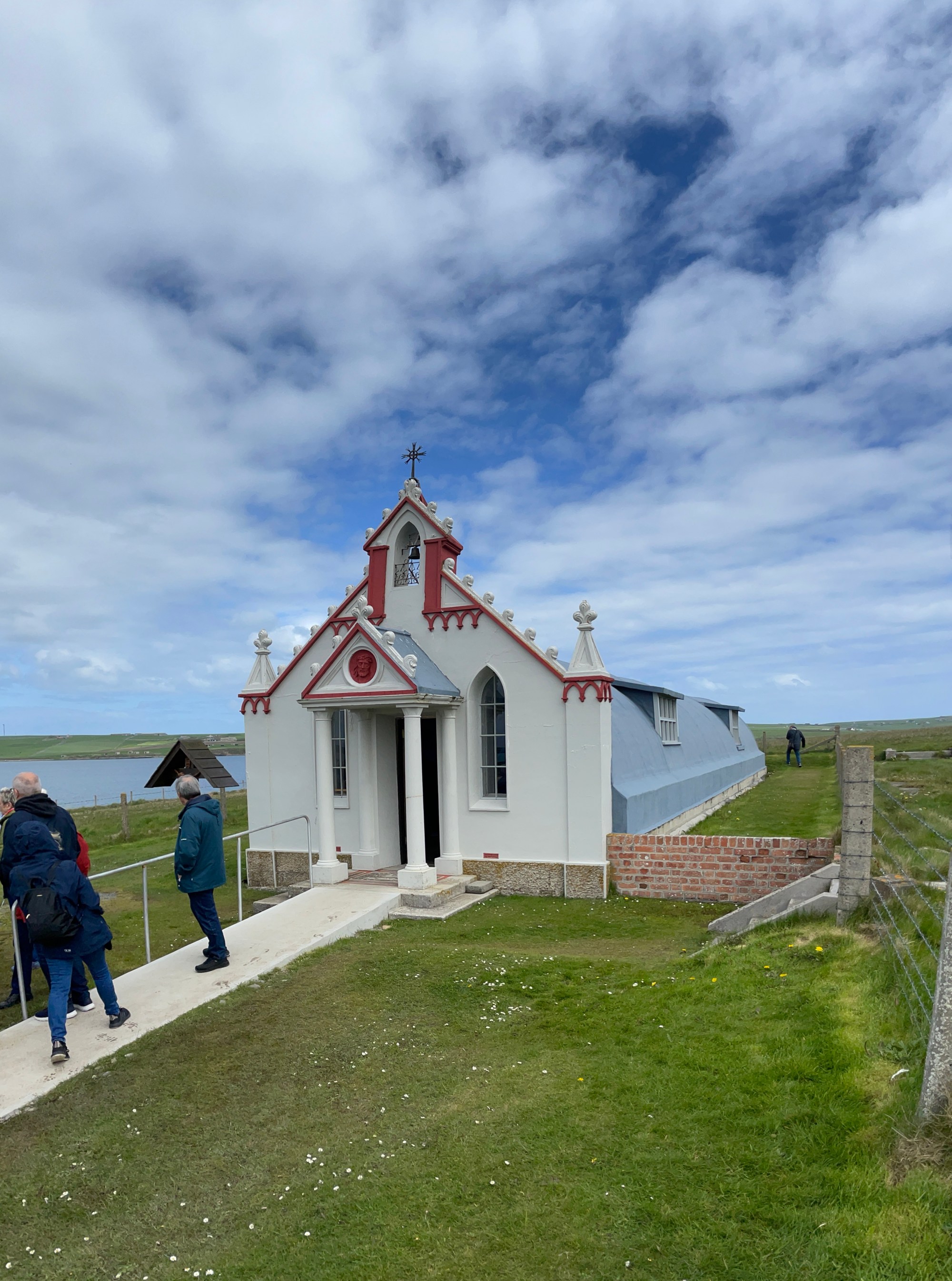 Der nächste Stopp war die italienische Kapelle, die seit 1987 in die Denkmalliste aufgenommen wurde. Das sogenannte Camp 60 beherbergte während des Zweiten Weltkrieges italienische Kriegsgefangene, die die Churchill Barriers bauen sollten. Da sie sehr religiös waren und ihre warme Heimat vermissten, erlaubte der Lagerkommandant ab 1942 den Bau der Kapelle. Ihre unterschiedlichen Begabungen führten zu wunderschönen 3D Wandmalereien.