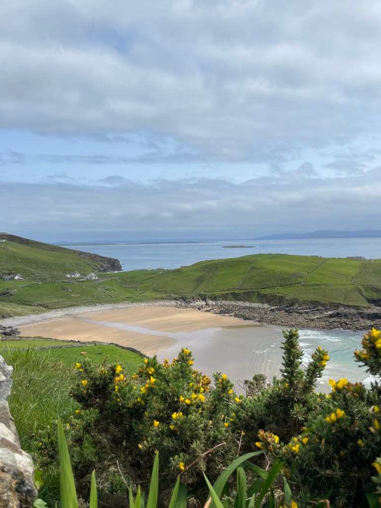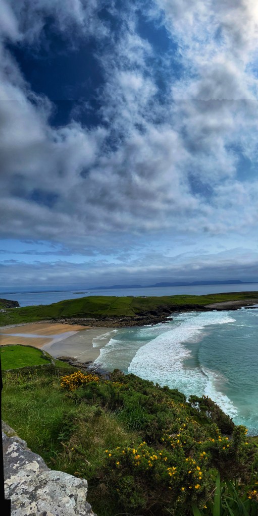 Der erste Stopp war am Muckross-Head, einer kleinen Halbinsel in der Grafschaft Donegal. Es ist ein sehr beliebtes Klettergebiet. Darüberhinaus gibt es hier zwei Strände, die bei Surfern sehr beliebt sind. Wir genossen den atemberaubenden Blick über die Bucht und sahen mehrere Kletterer in den gegenüberliegenden Felsen.