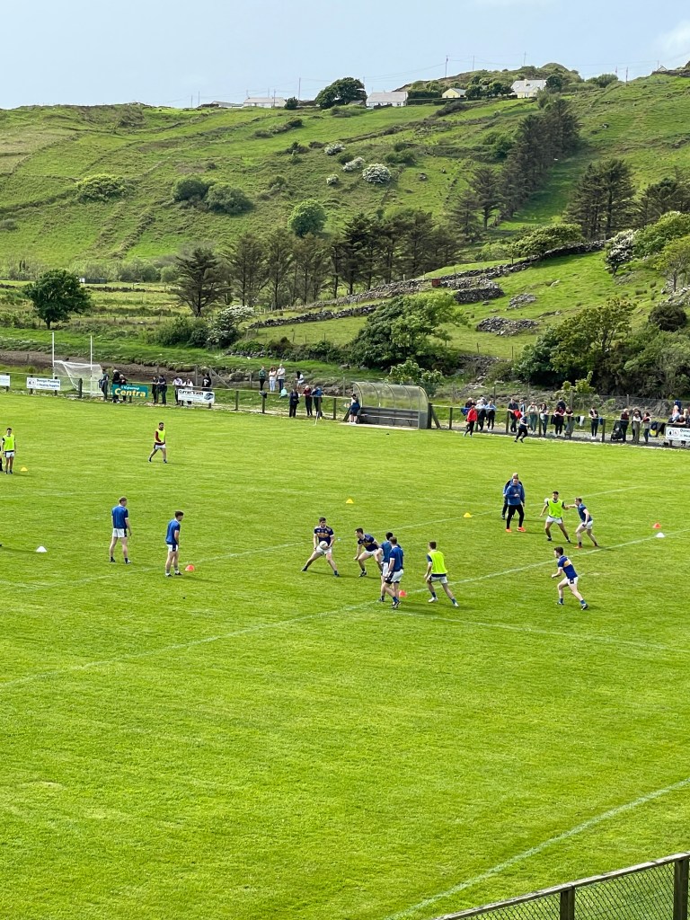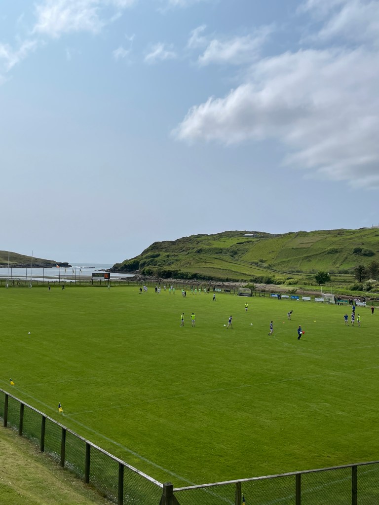 Während der Weiterfahrt fuhren wir am Spielfeld des Vereins CLG Chill Charta in Kilcar vorbei, dem 6-fachen Donegal-Meister. Da gerade Spielzeit war, hielten wir an, um ein wenig zuzuschauen. Gaelic Football ist eine Mischung aus Handball,Fußball und – wie unser Reiseleiter sagte- Kickboxen und Ringen. Der Football-Platz liegt direkt am Meer, was alleine schon etwas kurios ist, das Spiel ist für uns noch viel verrückter.