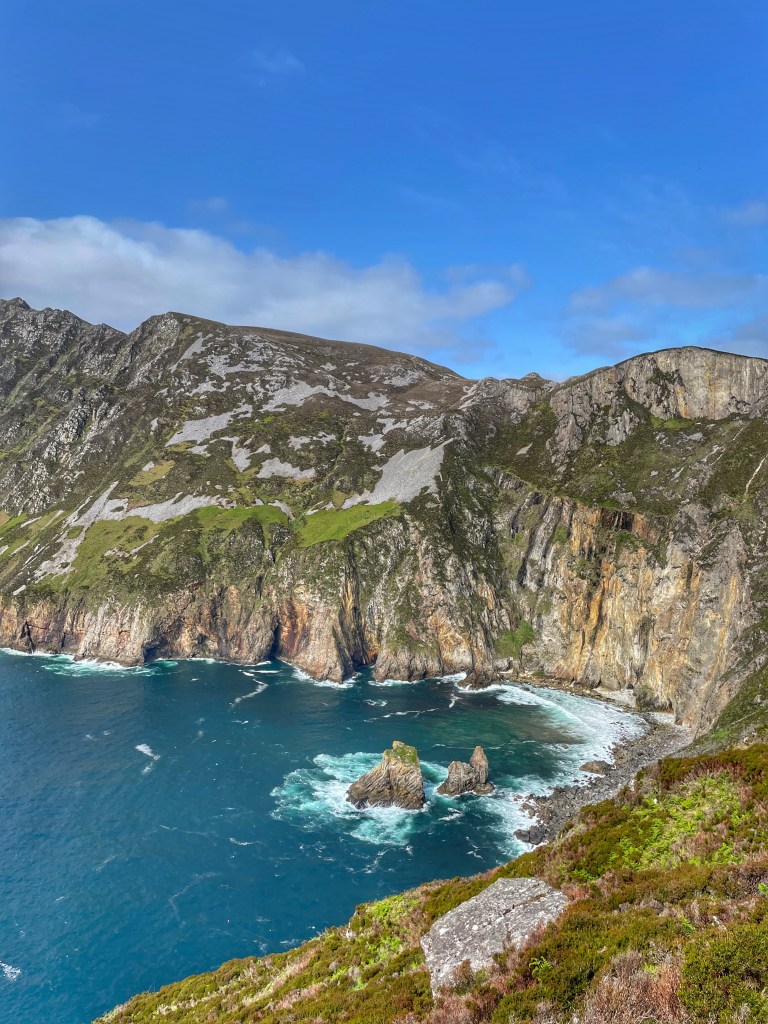 Wir waren schon gespannt und konnten es bei der Fahrt dorthin kaum erwarten. Was wir sahen, übertraf unsere Vorstellungen – ein atemberaubender Blick! Man kann über den Bergrücken wandern auf dem sogenannten ‚One Man‘s Path‘ – herausfordernd und bei leichtsinnigem Verhalten gefährlich. Jedes Jahr lassen 5 Menschen dort ihr Leben, weil sie sich nicht an die Anweisungen halten. Für eine derartige Wanderung war keine Zeit. Deshalb genossen wir diese gewaltige Natur Irlands still und wagten uns auch auf die Holzplattform direkt über der Bucht – eine wahnsinnige Schönheit, die demütig macht. Hier wachsen auch die vielfältigsten alpinen Pflanzen und in einer Bucht leben hunderte von Robben.