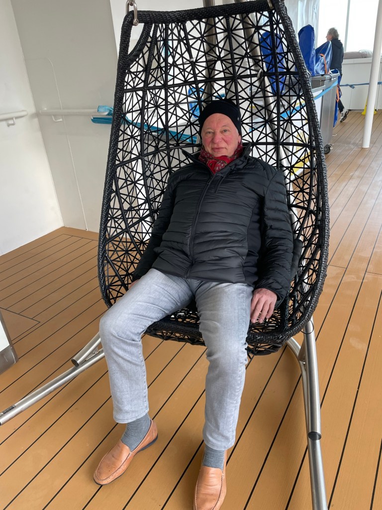 Bei unserem Spaziergang an Deck schwappten die Wellen aus dem Pool. Trotz der Kälte meinte Norbert, er hat in der Schaukel schon karibische Feelings (hoffentlich ist der Blick in der Karibik anders 😉)