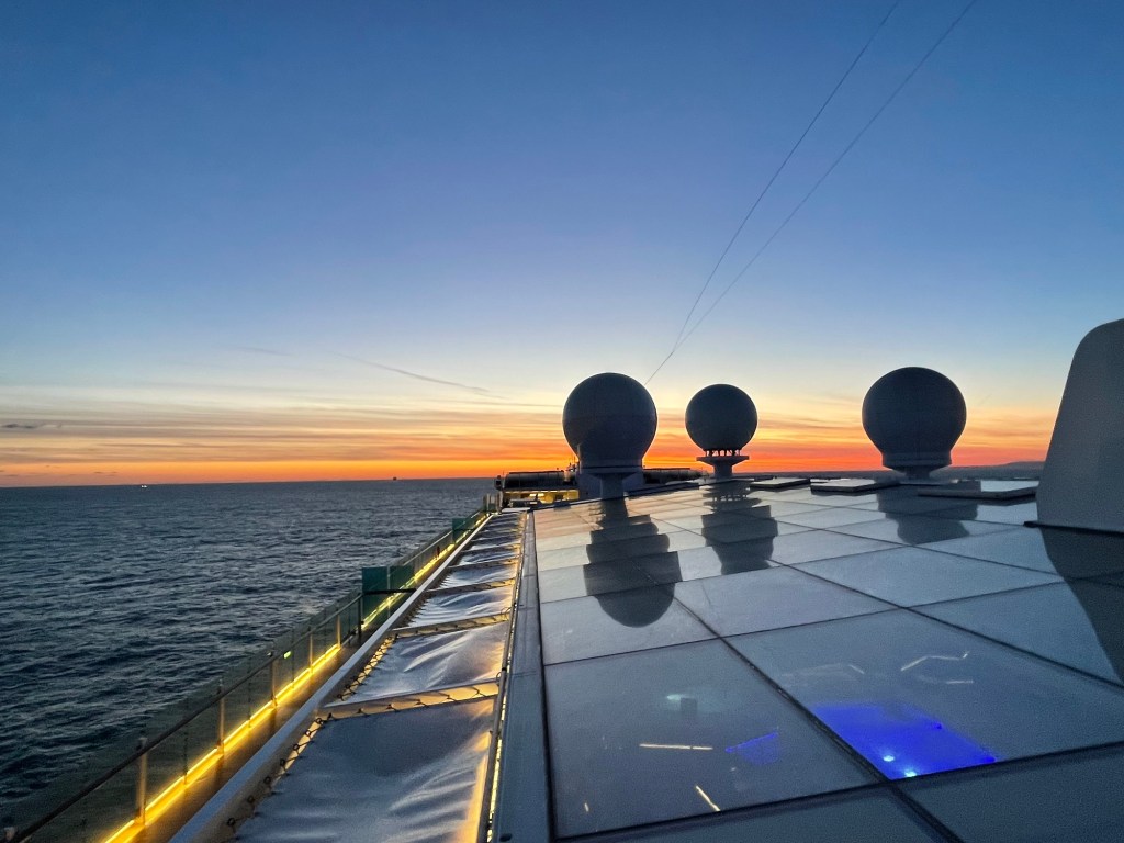 Ab 14 Uhr hörte der Wellengang auf – wir drehten unsere Runden an Deck und wurden mit herrlichen Blicken belohnt. Bei Sonnenuntergang waren wir auf der Höhe der Kreidefelsen in Dover.
