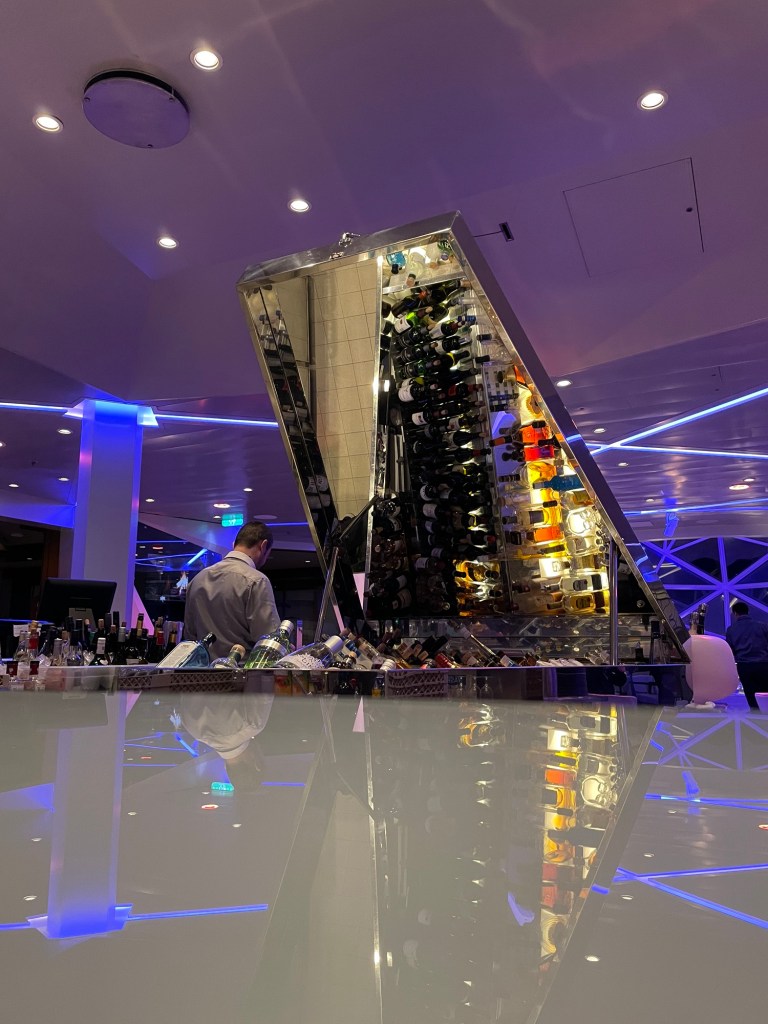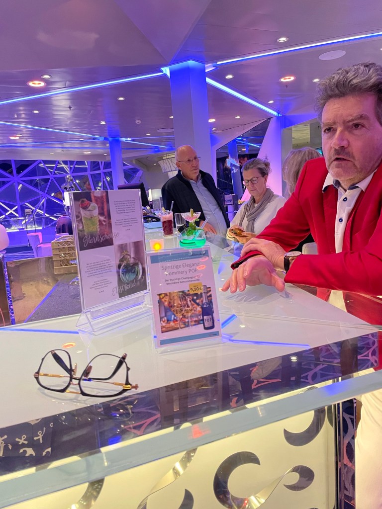 In der Diamantbar saßen wir uns gegenüber – und die Schweizer sagten: „Gruezi, wir kennen uns! Waren Sie zufällig 2019 auf der Queen Victoria?“ Wir haben schöne Erinnerungen ausgetauscht und die Schweizer – witzig wie immer – haben einen Elbstrand-Cocktail bestellt, bei dem der Boden beleuchtet wird.
