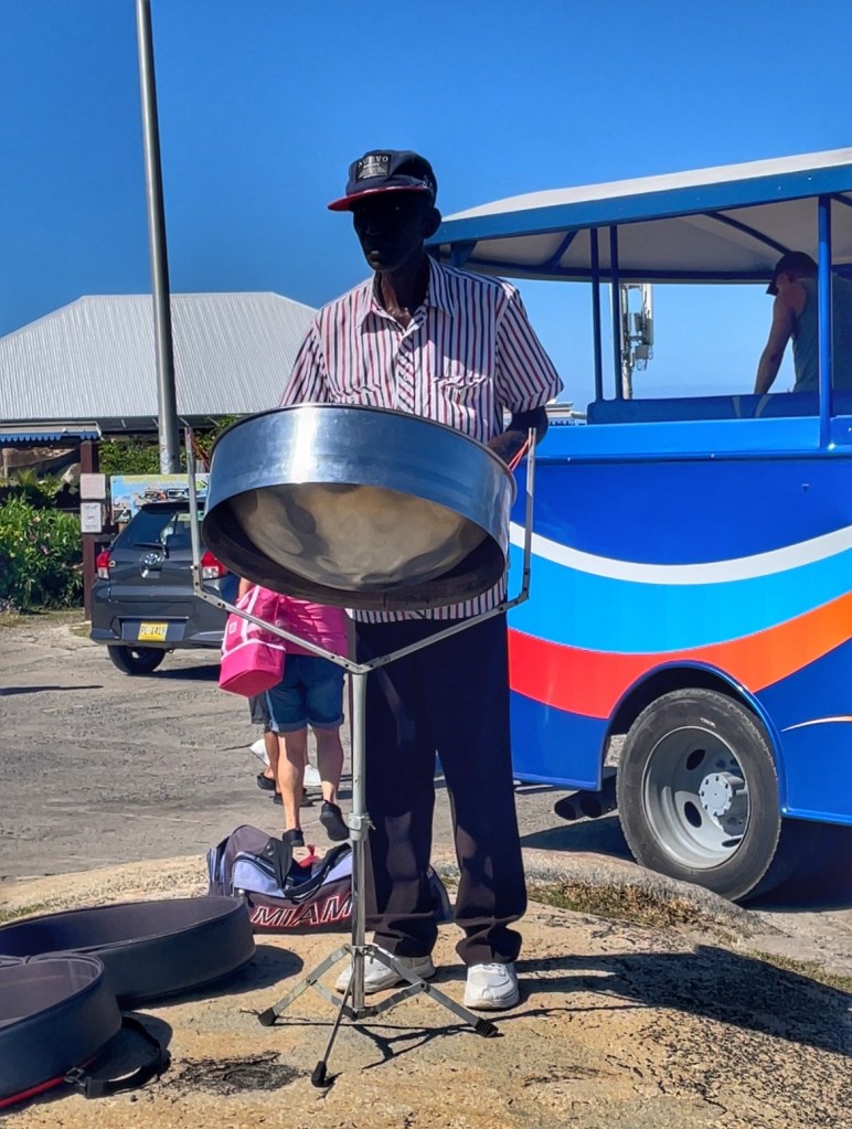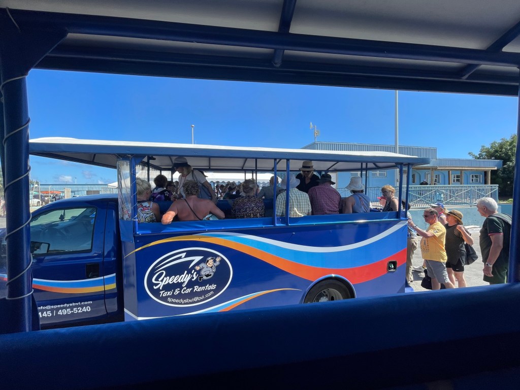 Nach der Ankunft fahren wir mit einem offenen Safaribus nach The Baths über sehr holprige Straßen. Dort werden wir mit karibischer Musik begrüßt.