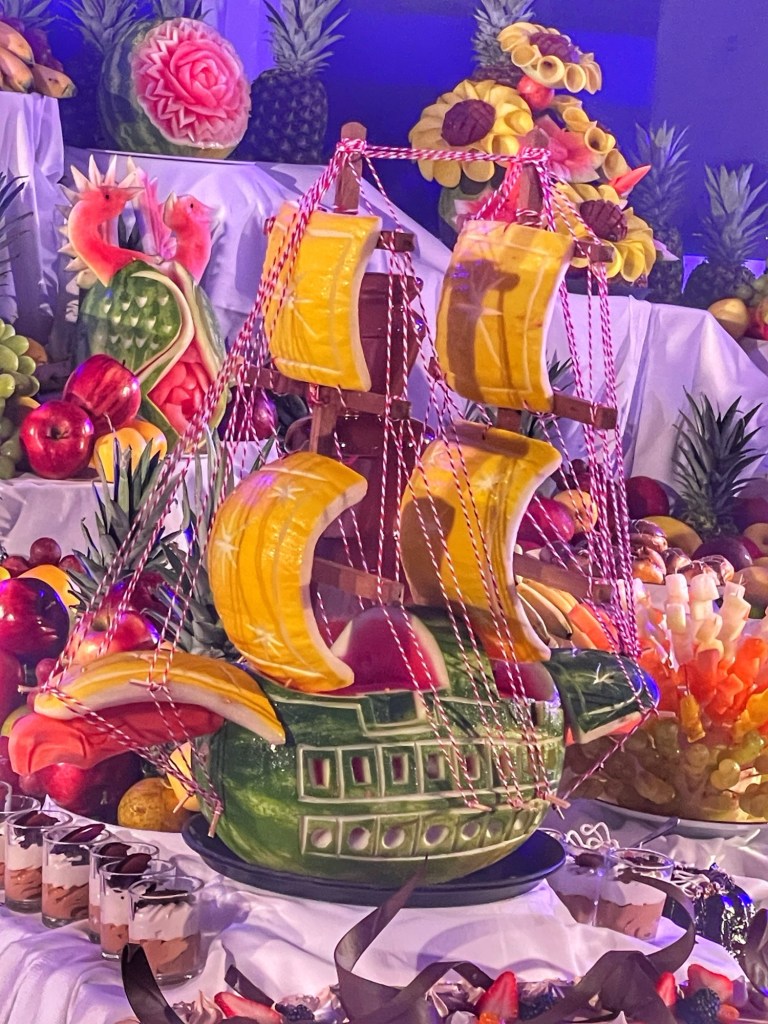 Dresscode: Ganz in Weiß! Und es hielten sich erstaunlich viele Passagiere daran. Ein tolles Obstbuffet mit künstlerischen Schnitzereien ergänzte das Angebot. An Bord gibt es 1 Mitarbeiter, der nichts anderes macht als den ganzen Tag Figuren, Gesichter etc schnitzen.