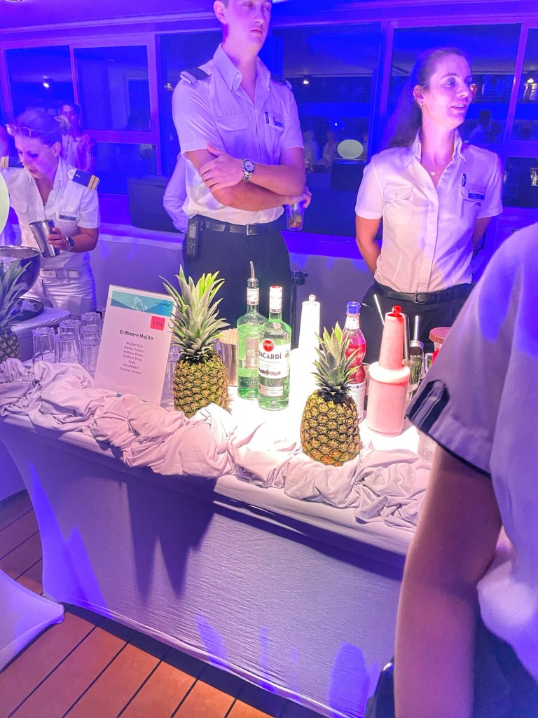 An diesem Tag müssen die Offiziere ran! Sie mixen heute Abend auf dem Pooldeck die unterschiedlichsten Drinks mit Gin und Rum. Von Bahama Mama bis Erdbeer Mojito gibt es so ziemlich alles. Dieser besondere Gin und Rum fährt 20.000 Seemeilen in den Fässern um die Welt. Danach erfolgt die Abfüllung in Flaschen zum Verkauf.
