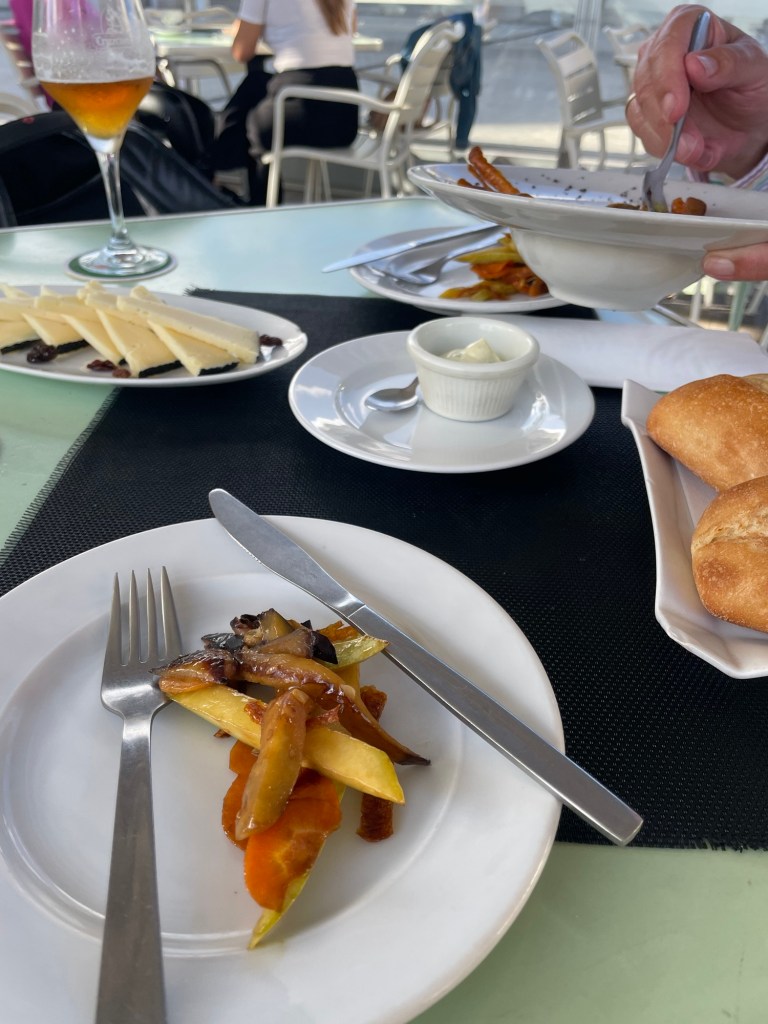 Nach einem langen Marsch durch die Stadt setzen wir uns in eine kleine Bar und essen ganz frische Tapas – sehr lecker! Gegen 18 Uhr machen wir uns auf den Weg zum Schiff. Wir laufen an der großen Kirmes vorbei, an Tribünen und sehen, dass inzwischen alles abgesperrt ist. Wir müssen einen riesengroßen Umweg laufen, um zum Schiff zu kommen und sind erst um 19.30 Uhr an Bord (alle Mann an Bord ist erst gegen 21.30 Uhr). Auf dem Weg sehen wir noch, wie die untergehende Sonne die Wolken anmalt.