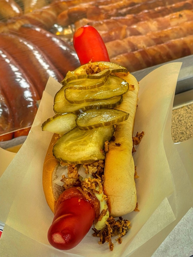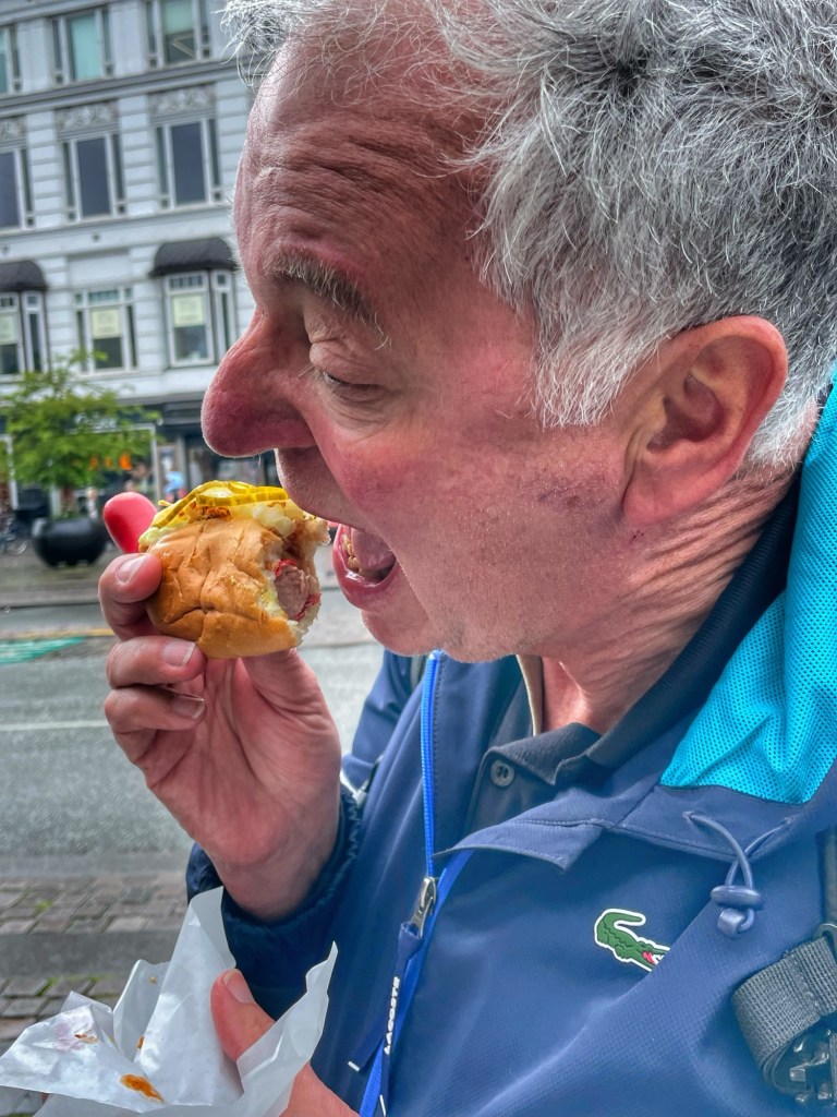 Nach der Tour hörte es auf zu regnen und wir entdeckten die Stadt zu Fuß. Natürlich musste man den echt dänischen Hot Dog probieren, den uns der Tourguide empfahl: rote Wurst mit Remoulade, Ketchup, Ziebeln und eingelegten Gurken in einem Brötchen. Es wird nicht unser Lieblingsessen!!