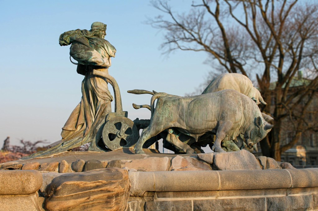 Der Gefion Brunnen in Kopenhagen zeigt die Statue der Göttin Gefion aus der germanischen Mythologie, die ihre vier Söhne in Ochsen verwandelt haben soll. Die Sage erzählt, das Ochsengespann habe beim Pflügen aus der Mitte Schwedens ein großes Loch gerissen und die Landmasse in die Ostsee geschleudert. Das Loch in Schweden bildet heuten den Vänern-See. Aus dem herausgerissenen Landstück soll die Insel Seeland entstanden sein.