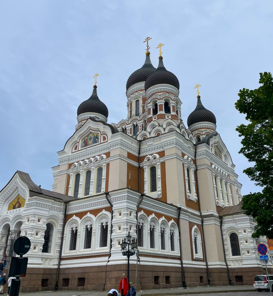 Wir fuhren zurück in die Altstadt und natürlich ist ein absolutes Must die Alexander-Newski-Kathedrale. Die bunte Kathedrale aus dem 19. Jahrhundert ist eines der Wahrzeichen von Tallinn. Sie fällt mit ihren zwiebelförmigen Türmen, der rötlich-orangen Farbe und den goldenen Kreuzen im Vergleich zu den anderen Bauwerken in der Altstadt extrem auf. Und sie ist – wie alle orthodoxen Kirchen innen sehr, sehr prunkvoll (Fotografieren verboten).