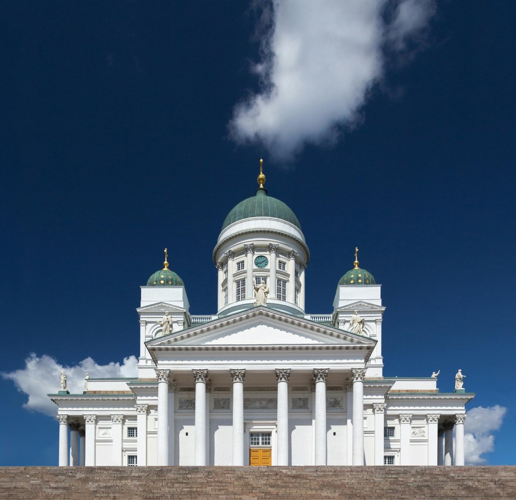 Das liegt zum einen an seiner Lage. Zum anderen an seiner Farbe. Die „Tuomiokirkko“ (übersetzt „Dom“) in strahlendem Weiß wurde auf einem Sockel im Zentrum der Stadt erbaut. Dadurch ist der Dom von Helsinki bereits aus der Ferne sehr gut sichtbar.